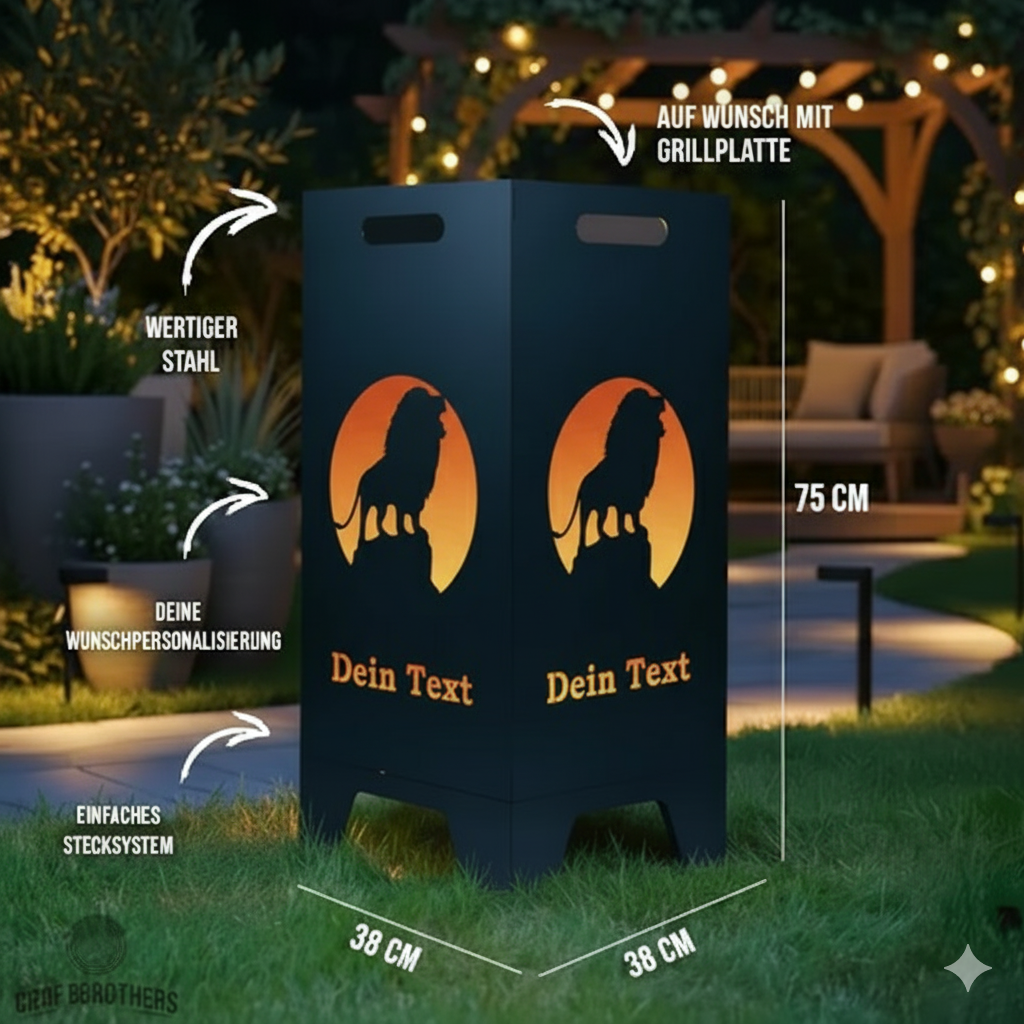 Unsere Feuertonne "Löwe" aus hochwertigem Stahl ist der perfekte Eyecatcher für jeden Garten. Der Feuerkorb ist langlebig und beständig. Das Motiv kommt wunderbar zur Geltung, sobald ein Feuer darin flackert.