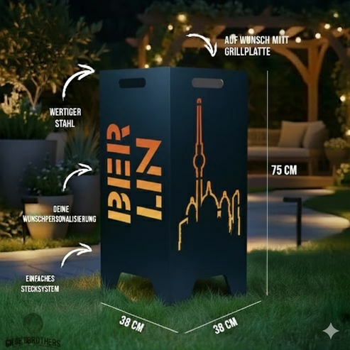 Unsere Feuertonne "Berlin" aus hochwertigem Stahl ist der perfekte Eyecatcher für jeden Garten. Der Feuerkorb ist langlebig und beständig. Das Motiv kommt wunderbar zur Geltung, sobald ein Feuer darin flackert. Jede Seite des Designs ist unterschiedlich.