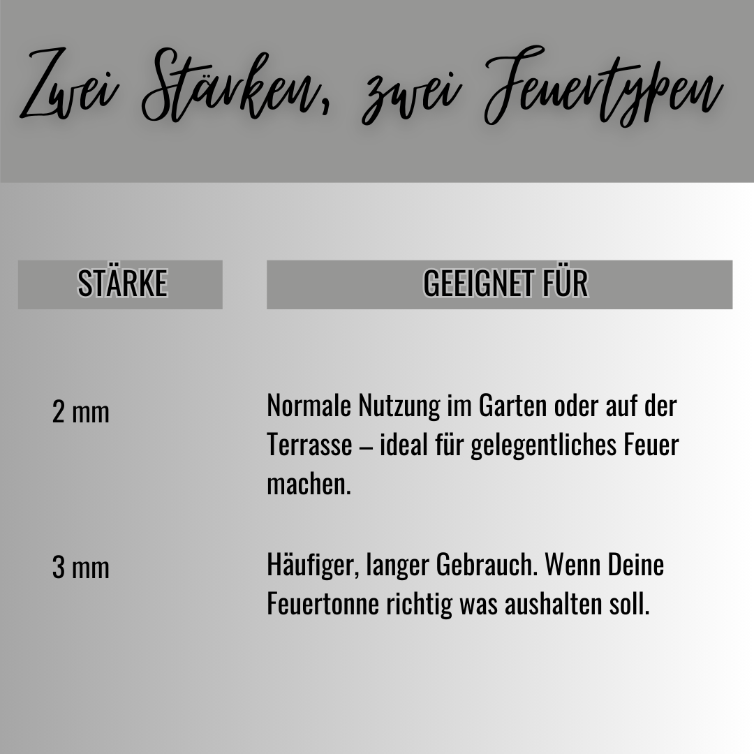 Ob für gemütliche Abende am Feuer oder den regelmäßigen Dauereinsatz – du kannst zwischen zwei Materialstärken wählen: