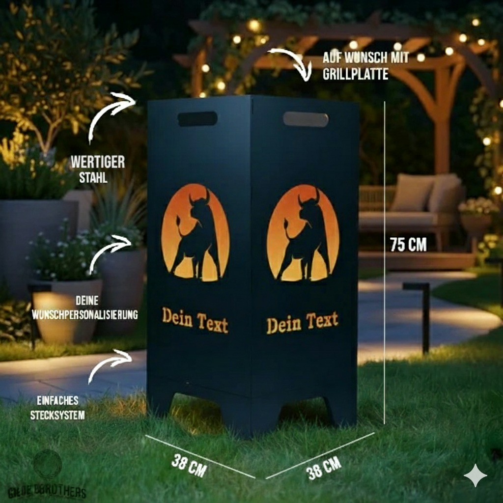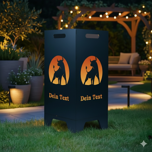 Unsere Feuertonne "Bulle" aus hochwertigem Stahl ist der perfekte Eyecatcher für jeden Garten. Der Feuerkorb ist langlebig und beständig. Das Motiv kommt wunderbar zur Geltung, sobald ein Feuer darin flackert.