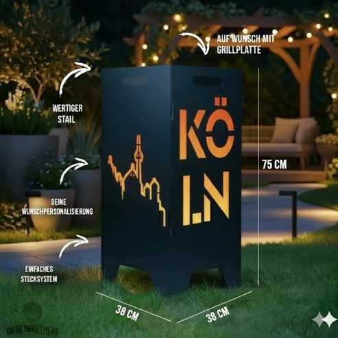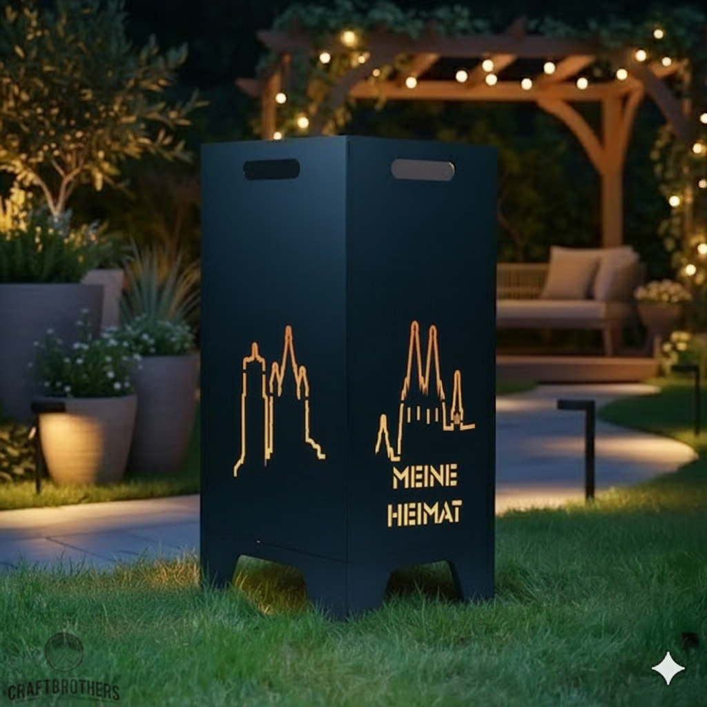 Unsere Feuertonne "Köln" aus hochwertigem Stahl ist der perfekte Eyecatcher für jeden Garten. Der Feuerkorb ist langlebig und beständig. Das Motiv kommt wunderbar zur Geltung, sobald ein Feuer darin flackert. Jede Seite des Designs ist unterschiedlich.