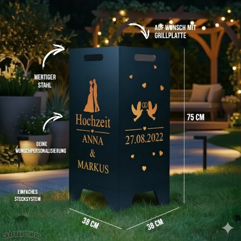 Feuertonne personalisierbar - Hochzeit - Brautpaar und Tauben aus edlem Stahl