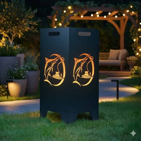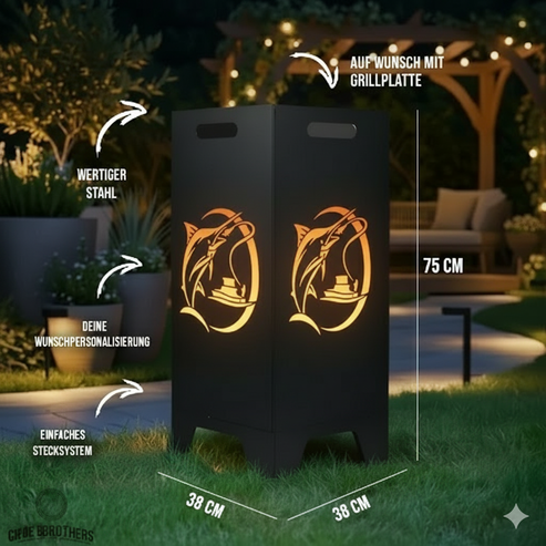 Unsere Feuertonne "Speerfisch" aus hochwertigem Stahl ist der perfekte Eyecatcher für jeden Garten. Der Feuerkorb ist langlebig und beständig. Das Motiv kommt wunderbar zur Geltung, sobald ein Feuer darin flackert. Alle vier Seiten des Designs sind identisch.