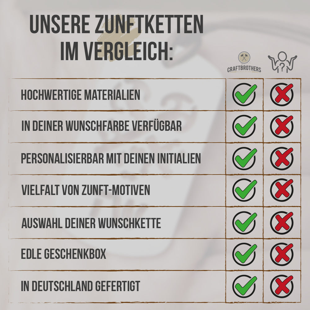 Du liebst es, mit deinen Händen zu arbeiten und bist stolz darauf, dein Handwerk zu beherrschen. Trage unsere Zunft-Stolz Kette und zeige, aus welchem Holz du geschnitzt bist. Mit unserer Zunft-Stolz Kette kannst du deine Handwerkskunst repräsentieren und zeigen, worauf du wirklich stolz bist.