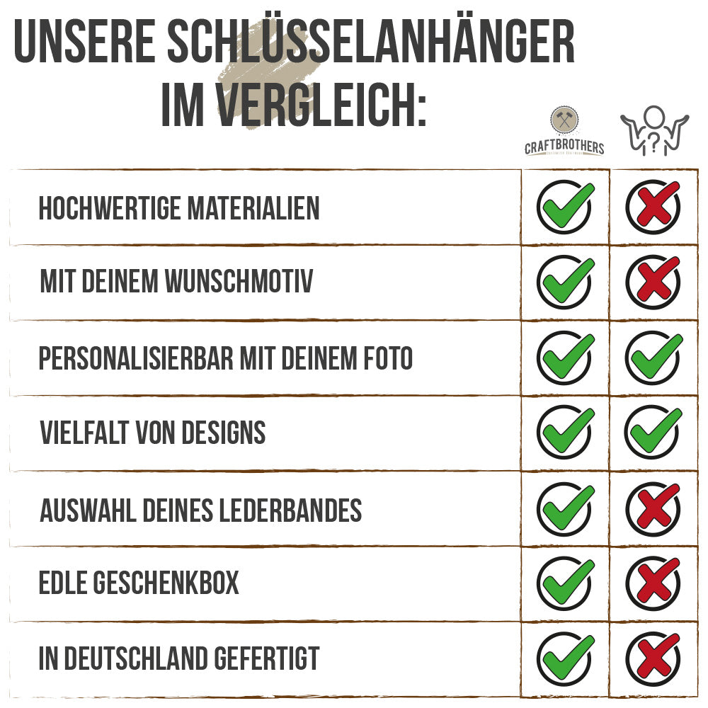 Dein personalisierter Schlüsselanhänger ist aus hochwertigem, gebürstetem Stahl gefertigt, was ihm eine erstklassige Haltbarkeit und Robustheit verleiht. Durch die Verwendung von UV-Direktdruck erhält deine Personalisierung eine tolle Schärfe und Qualität. Mit der anschließenden Klarlackversiegelung ist die Personalisierung optimal gegen Abnutzung und Verblassen geschützt. Das abgesteppte Lederband sorgt für eine angenehme Haptik und verlängert die Lebensdauer des Anhängers. Zusätzlich bieten wir eine Schutzfolie an, um Deinen Schlüsselanhänger gegen starke mechanische Einwirkungen wie Kratzer zu schützen. Mit diesen hochwertigen Materialien und Techniken kannst Du sicher sein, dass Dein Schlüsselanhänger langlebig und von exzellenter Qualität ist.