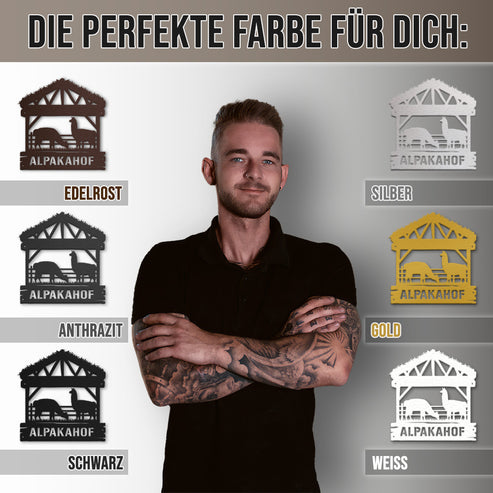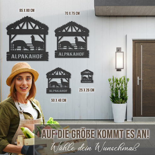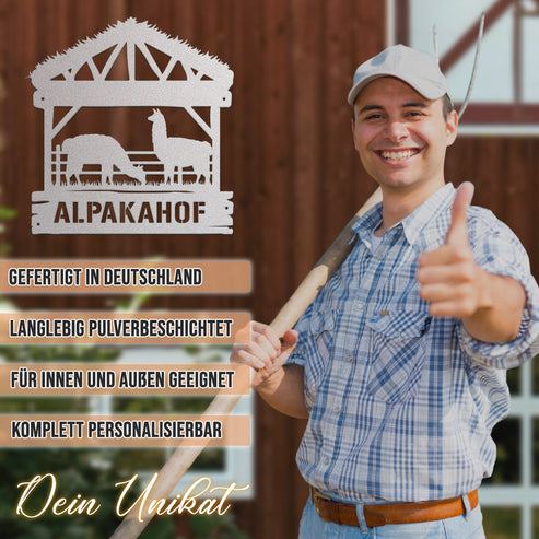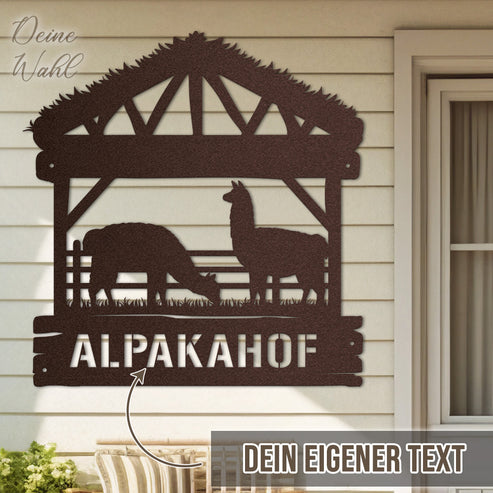 Unser "Hofschild - Alpaka" mit Wunschtext aus hochwertigem Stahl ist der perfekte Dekoartikel für jede Alpakahof. Langlebig und beständig eignet es sich sowohl für den Innen- als auch den Außenbereich. Unser Hofschild ist in verschiedenen Farben und Größen erhältlich.