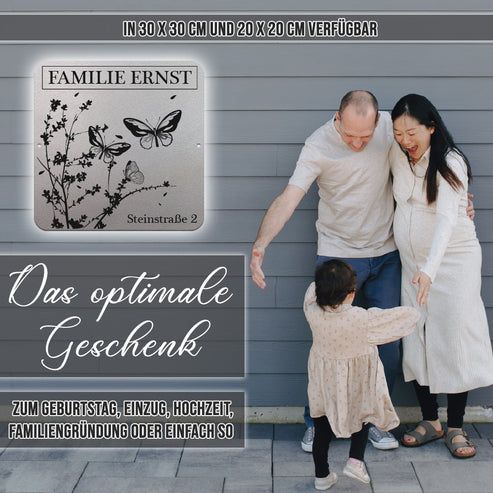 Unser personalisierbares Türschild aus hochwertigem Stahl macht dein Zuhause zum perfekten Eyecatcher - eine tolle Geschenkidee beispielsweise zum Einzug ins Eigenheim.